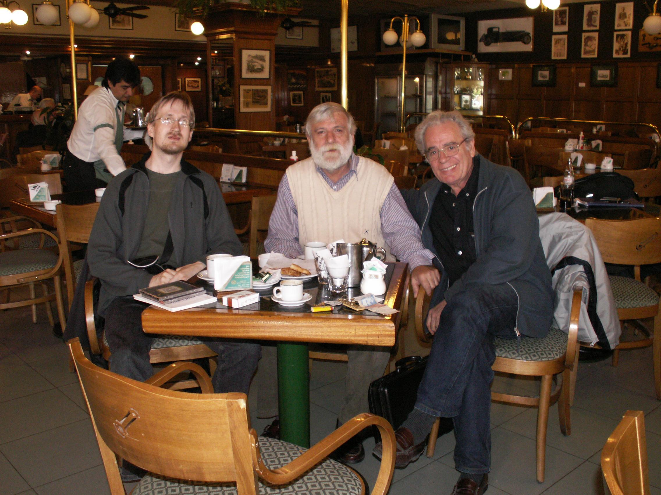 Kahvilla argentiinalaisten säveltäjien kanssa. Vas. Ari Romppanen, Carmelo Saitta sekä Julio Martín Viera